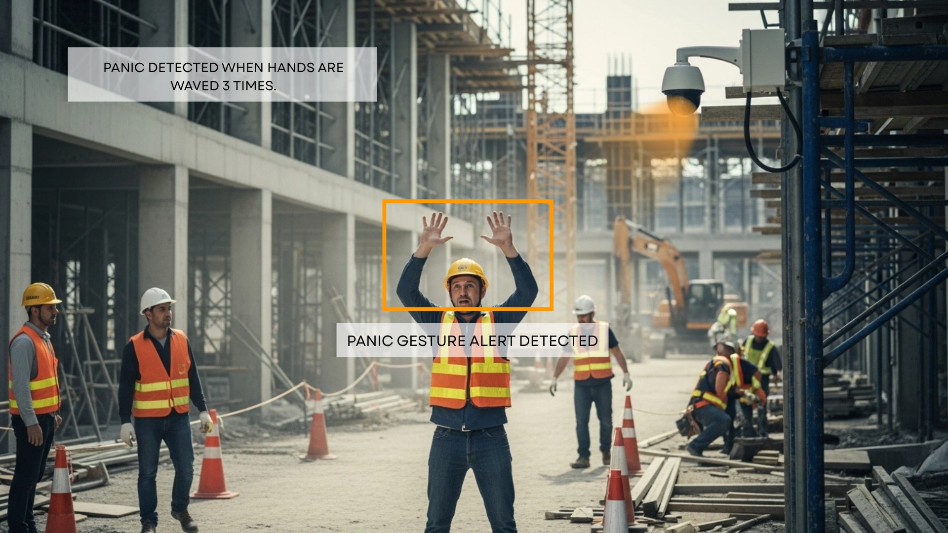 Detects distress gestures such as raised hands or unusual movements in real time. Enables quick response to emergencies or security threats across warehouses and yards.